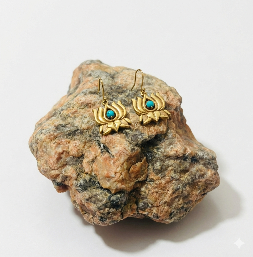 🌸 Handmade Brass Lotus Earrings with Turquoise Stone