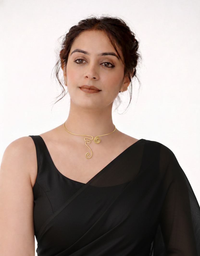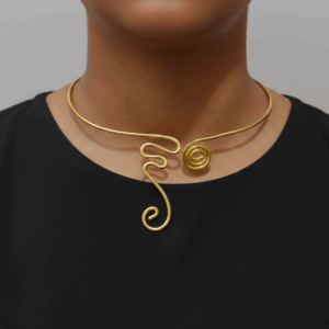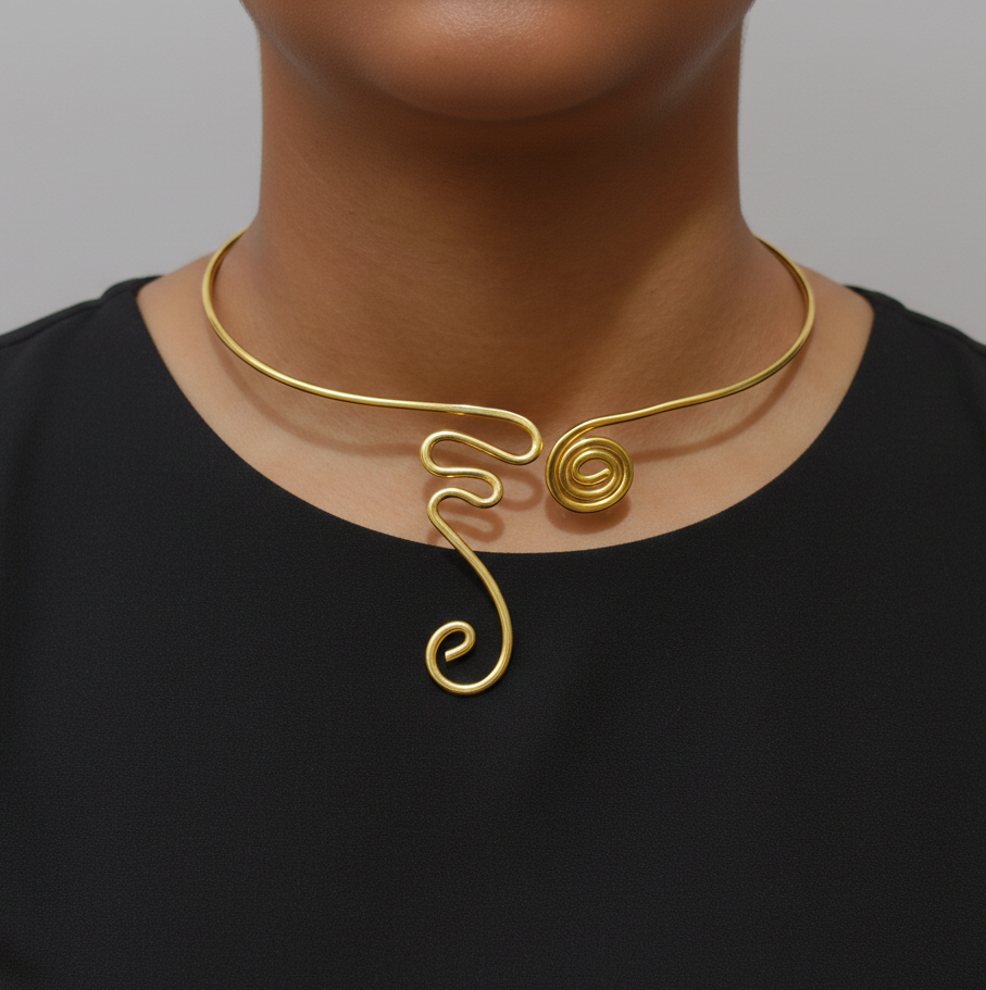 Product Description: Elevate your everyday style with the [JAMNASHA] Abstract Swirl Wire Choker. This stunning piece of jewelry bridges the gap between traditional charm and contemporary art. Designed for the modern woman, this necklace features a fluid, gold-toned wire construction that curves into a delicate spiral centerpiece.