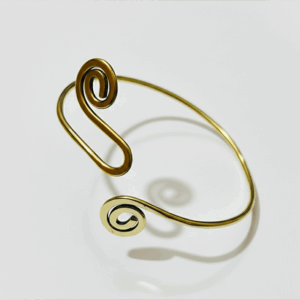 This handcrafted gold finish double spiral open bangle is a celebration of flowing form and quiet elegance. The graceful spiral ends curve naturally into an open cuff design, creating a balanced, artistic look inspired by movement and continuity.