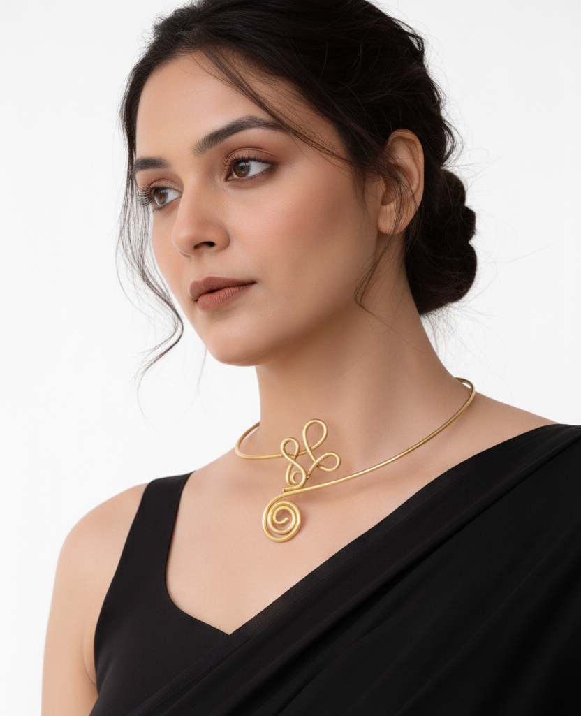 Make a bold style statement with this handmade wire work brass Hasli necklace, inspired by tribal and bohemian Indian jewelry traditions. Carefully handcrafted by skilled artisans, this Hasli choker features intricate wire detailing and a strong ethnic character that reflects timeless craftsmanship.