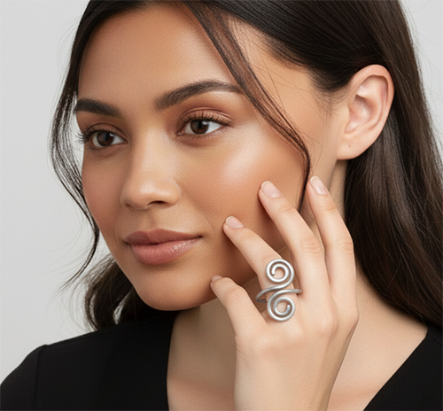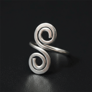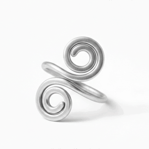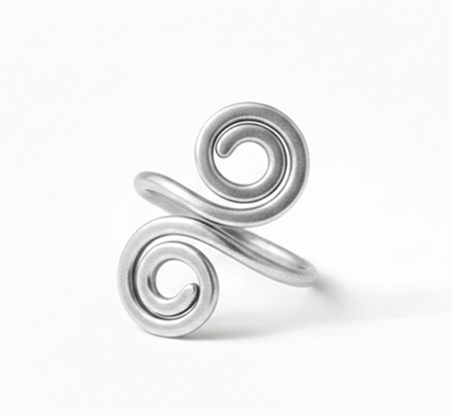 Sculpted by hand from warm, silver brass, this spiral ring is a bold expression of organic form and timeless design. The flowing double-swirl silhouette reflects movement, balance, and quiet strength—making it more than jewelry, but wearable art.