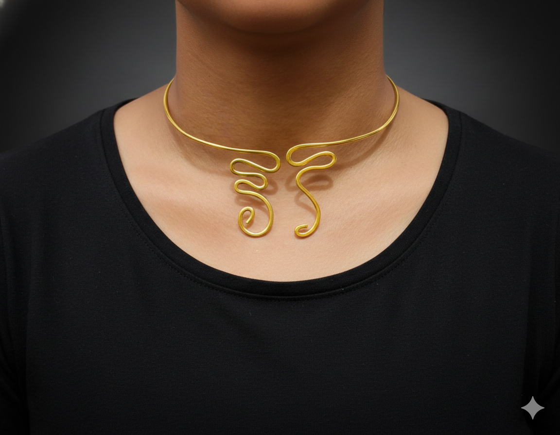 Elevate your style with this Handmade Wire Work Brass Hasli Necklace for Women, finished in elegant gold color. Designed with fine craftsmanship, this adjustable necklace blends traditional charm with modern fashion, making it a versatile accessory for ethnic as well as contemporary outfits. Lightweight yet durable, it adds a bold and graceful touch to any look.